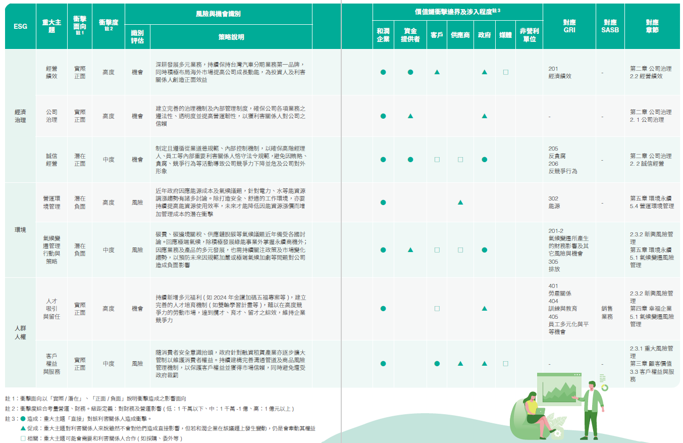 和潤企業依循GRI 最新發佈通用準則的《GRI 3:重大主題》,建立系統化流程以鑑別重大利害關係人與重大主題。和潤企業蒐羅2024 年衝擊因子、歸納且定義永續議題,同時盤點與辨識各個永續議題對於企業實際與潛在的正負面衝擊,納入整體企業風險管理(ERM)評估,加以管理與設定目標。和潤企業2024 年重大主題採雙重重大性分析方法,識別出7 項年度重 大主題,並提報董事會及ESG 永續經營委員會。和潤企業依循GRI 最新發佈通用準則的《GRI 3:重大主題》,建立系統化流程以鑑別重大利害關係人與重大主題。和潤企業蒐羅2024 年衝擊因子、歸納且定義永續議題,同時盤點與辨識各個永續議題對於企業實際與潛在的正負面衝擊,納入整體企業風險管理(ERM)評估,加以管理與設定目標。和潤企業2024 年重大主題採雙重重大性分析方法,識別出7 項年度重 大主題,並提報董事會及ESG 永續經營委員會。