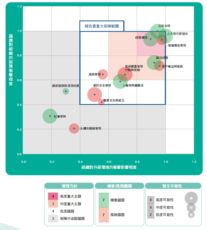 | 辨認實際與潛在衝擊 | Step3:將企業衝擊因子整合為永續議題 經顧問團隊與永續經營委員會小組討論後,將衝擊因子依主題整合為14個年度永續議題,同時針對所識別出之永續議題定性分析,並進行後續重大性分析,以作為重大主題管理方針依據。 | 14個永續議題 E面向2個 S面向5個 G面向7個 |