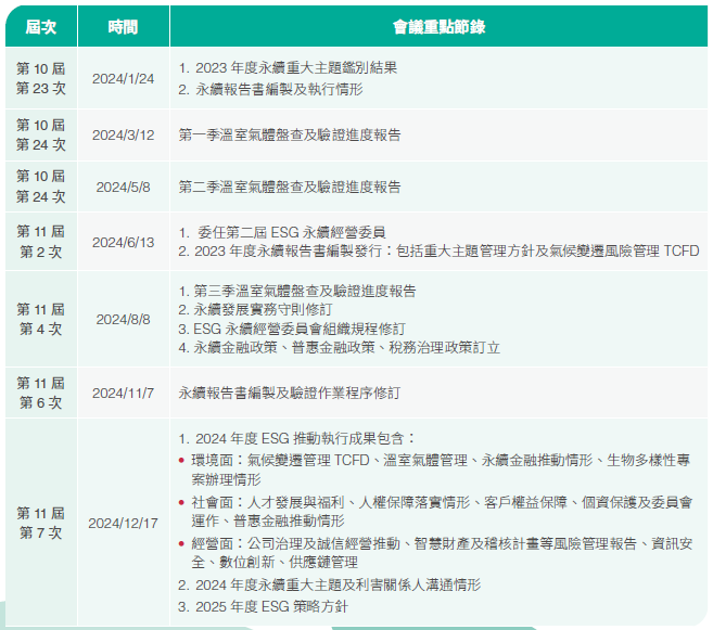| 氣候變遷管理 行動與策略 | 積極回應氣候變遷議題並規劃管理措施,簽署支持TCFD,並逐年提高揭露比例。2024 年更經董事會通過訂定《永續金融政策》,結合核心業 務能力驅動社會永續轉型 | 落實董事會監督氣候變遷管理機制 | 針對氣候變遷管理之相關議案,每季提報董事會,2024 年共計提報4 次 | 持續落實氣候變遷治理機制,確保各項行動之有效性 |
